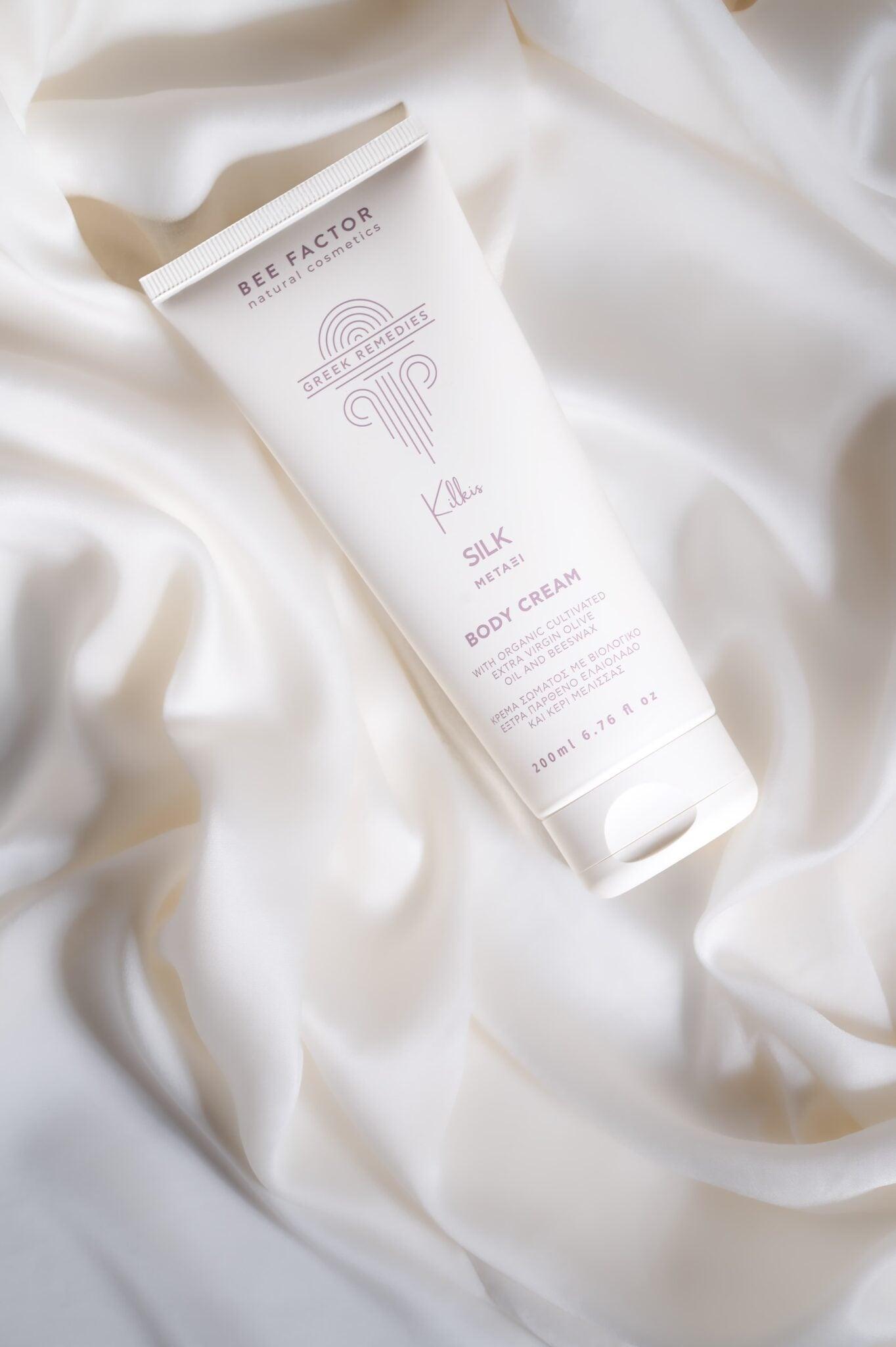 Πλούσια κρέμα σώματος που περιέχει ελληνικό εκχύλισμα μεταξιού με προέλευση από το Κιλκίς Μακεδονίας. Με ισχυρές ενυδατικές ιδιότητες είναι το ιδανικό προϊόν για να ξεδιψάσετε την επιδερμίδα σας και να ολοκληρώσετε τη καθημερινή σας περιποίηση.
